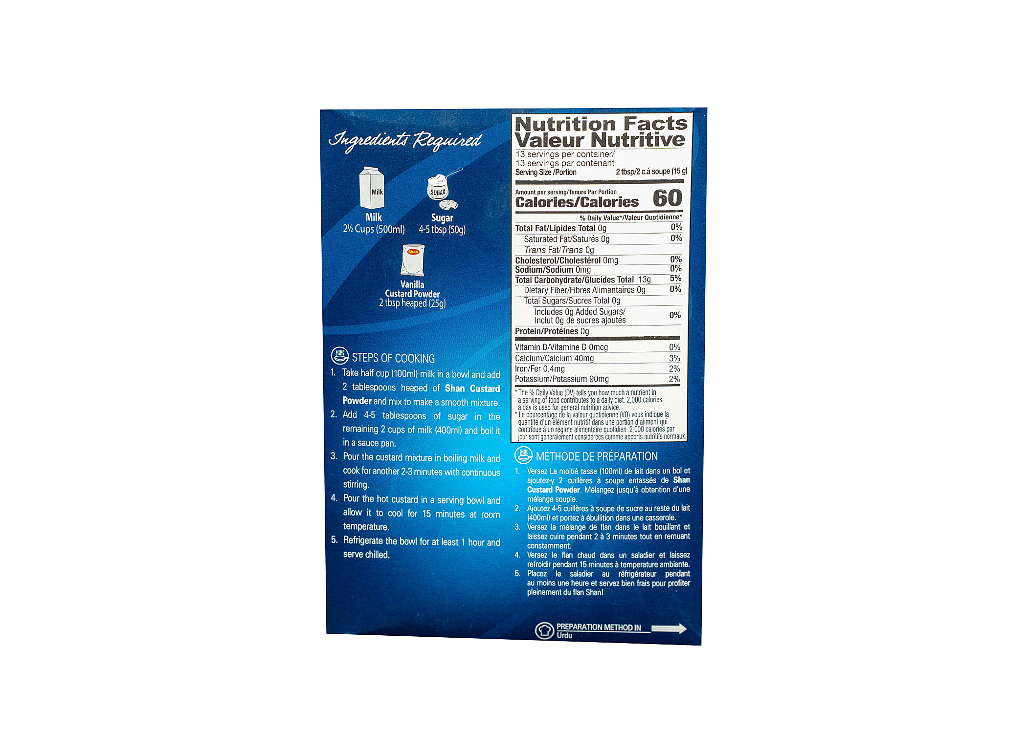 Shan Custard Powder Vanilla is a rich, creamy dessert mix that allows you to easily create delicious vanilla-flavored custards. It’s a 100% vegetarian product and is sealed for freshness, ensuring ISO-certified quality. This versatile powder is perfect for enhancing fruit salads, puddings, and other sweet treats, offering a smooth texture and delightful vanilla taste.